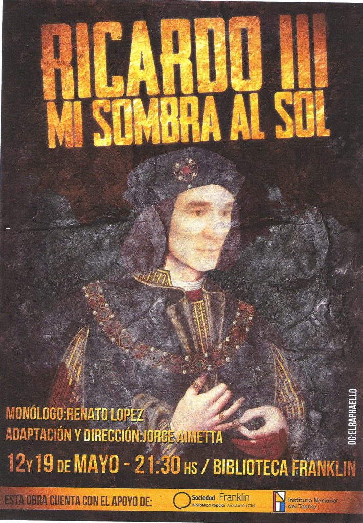 Obra de Teatro en la Franklin: Ricardo III : mi sombra al sol Monólogo Renato Lopez Adaptación y dirección Jorge Aimetta 12 y 19 de mayo, 21.30 hs. Entradas $150 Leer más …